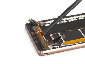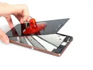 Снятие экрана выполняется так же, как и открытие задней крышки. Нагрейте, образуйте зазор, вставьте медиатор, проведите и разрежьте клей. Начните сверху.
