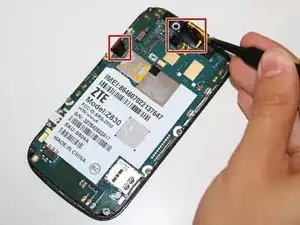 Снимите камеру, установив пинцет на золотую контактную площадку, прикрепленную к камере, и подденьте вверх, отсоединив ее от материнской платы.