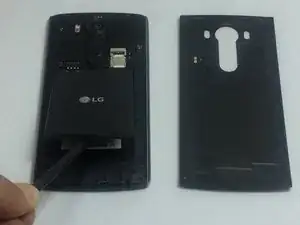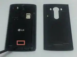 Вставьте плоский конец пластикового инструмента или кончик пальца между задней крышкой и разъемом зарядки LG V10.