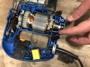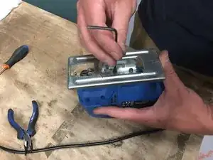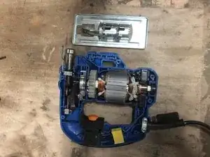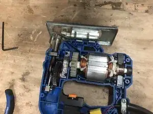 Установите двигатель, затем крепление лезвия и в завершение угольники.