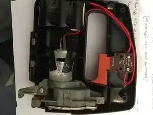 Лобзик был разобран и выявил два дефекта: (1) не было напряжения от NiCd аккумуляторного блока, и (2) в щеткодержателе двигателя постоянного тока произошёл излом.
