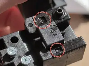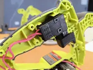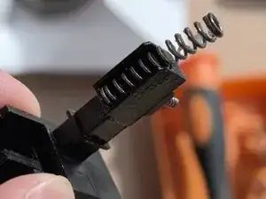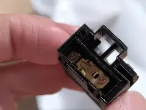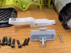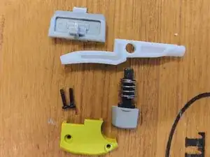 После снятия внешнего корпуса можно легко извлечь механизм блокировки. Сначала идёт деталь рядом с кнопкой включения, которая предотвращает случайное включение.