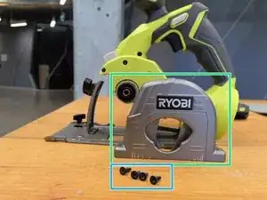 Далее следует блокировочный механизм рядом с пильным диском, предназначенный для фиксации диска при его снятии. Два более мелких винта с шестигранной головкой, снятые ранее, крепят эти детали.