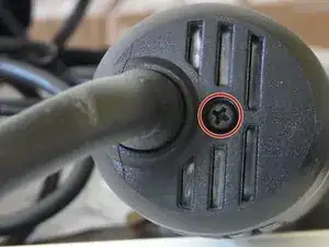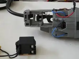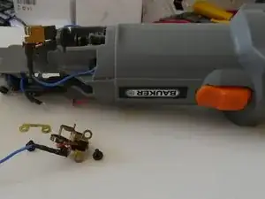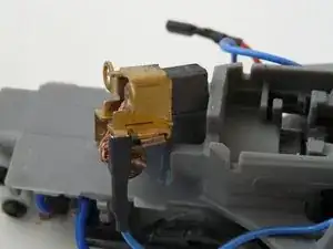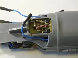 Синий нейтральный клеммник скрыт чёрным штоком активации выключателя. Он проходит от внешней оранжевой кнопки (к сожалению, обрезанной программой iFixit на этом фото) вдоль корпуса, змейкой проходит над клеммой, а затем под прямым углом опускается вниз для привода кнопки выключателя.