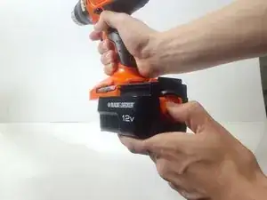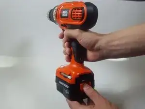 Отсоедините блок аккумулятора от дрели, нажав на кнопку освобождения аккумулятора и потянув аккумулятор на себя.