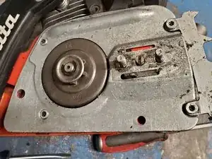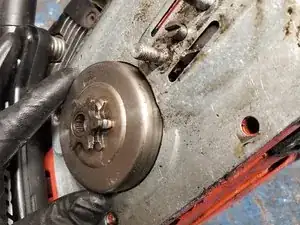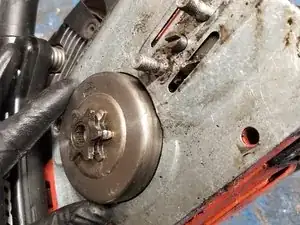 С помощью плоской отвертки снимите стопорную шайбу, затем разомкните тормоз цепи и извлеките барабан сцепления.