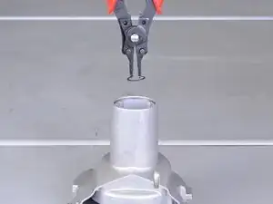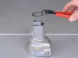 С помощью плоскогубцев для стопорных колец снимите стопорное кольцо внутри узкого конца кожуха вентилятора.