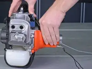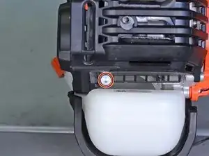 Снимите два винта Torx T25, крепящие кожух двигателя: один рядом с рукояткой стартера и другой рядом с основанием троса газа.