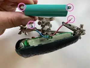 Подключите сторону новой батареи с белым кольцом (положительный полюс +) к красному проводу. Припаяйте синий провод к другой стороне (без белого кольца).