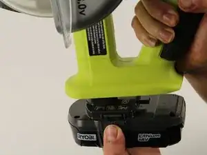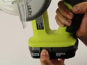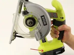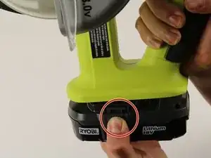 Поместите большой палец и указательный палец по обе стороны в основании RYOBI P501G, где находятся кнопки для освобождения батареи.