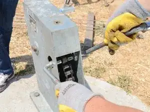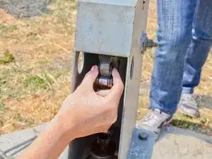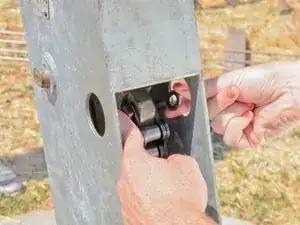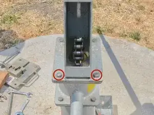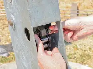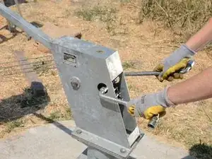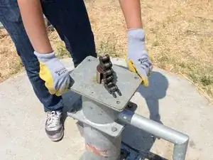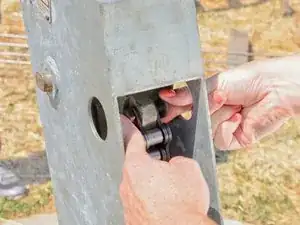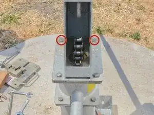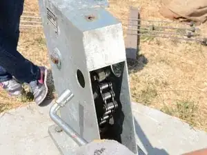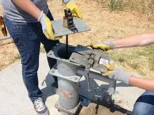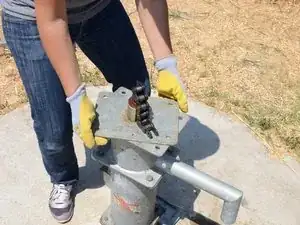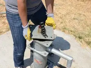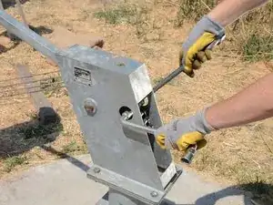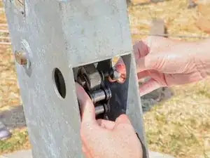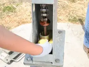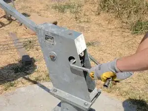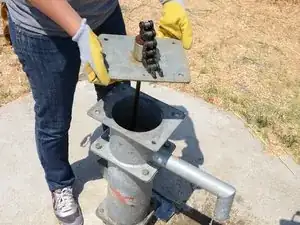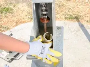 Через два отверстия для доступа установите на болт и гайку, прикрепляющие цепь к рукояти насоса, угловой трещоточный ключ с головкой.