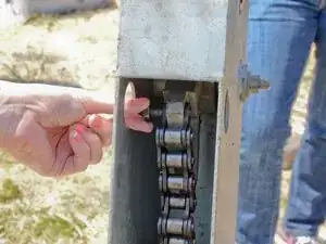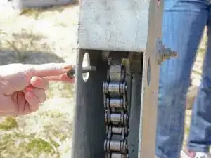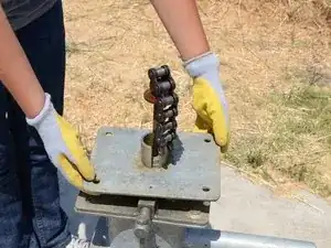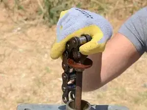 Поднимите рукоять насоса, пока основание цепи не опирается на распорную втулку и цепь не ослабнет. Держите рукоять в этом положении, пока цепь отсоединяют.