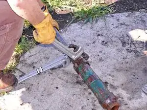 Используйте два трубных ключа, чтобы разъединить стояк и цилиндр насоса.