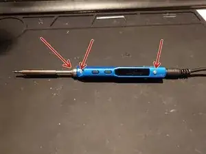 С помощью лопатки аккуратно разберите корпус рукояти паяльника, начиная со стороны гнезда жала. Старайтесь не сломать фиксирующие штифты возле краёв дисплея по обеим сторонам корпуса.