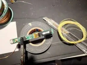 Соедините контакт плоского кабеля над оторванной площадкой с залуженной дорожкой (из шага 4) при помощи перемычки или тонкого провода (AWG32 и тоньше).