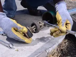 Используя другой ключ в качестве рычага, открутите клапан со штока насоса.