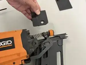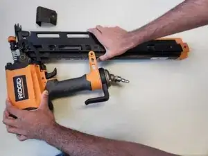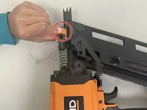 Снимите крышку контакта рабочей детали, потянув её перпендикулярно гвоздезабивателю.