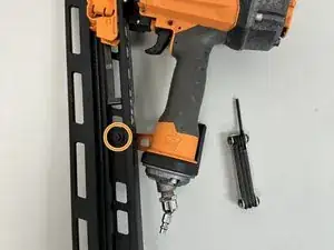 Сборка контакта рабочей детали имеет критическое значение для правильной работы пневматического гвоздезабивателя и состоит из нескольких частей, каждая из которых может выйти из строя и потребовать разборки всей сборки для восстановления правильной работы.