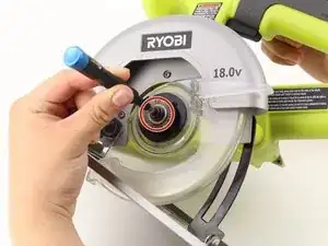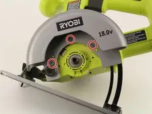 Найдите область, где лезвие соединено с двигателем, где расположен круглый кожух на Ryobi P501G.