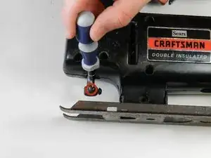 Чтобы зафиксировать лезвие, повторно затяните оба винта с плоским головкой размером 7/32" на зажиме лезвия пилы.