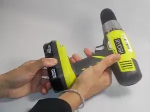 Отсоедините аккумулятор от корпуса дрели, нажав кнопки освобождения аккумулятора с обеих сторон блока и потянув наружу.