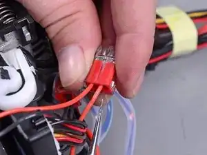 С удерживающим инструментом всё ещё вставленным потяните красный провод модуля управления из push-in разъёма.