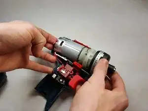 Осторожно извлеките мотор и сборку кнопки запуска из корпуса дрели. Уберите компоненты в одном куске, как показано на втором изображении.