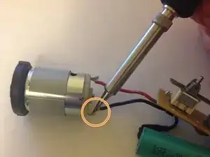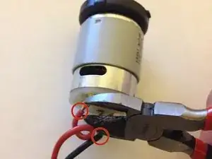 С помощью кусачек обрежьте чёрный и красный провода мотора там, где они присоединены к мотору. (Позже вы припаяете их к новому мотору.)