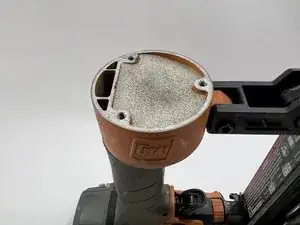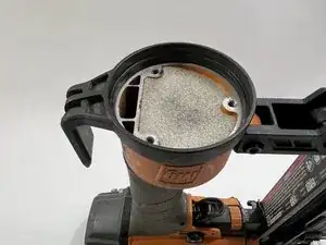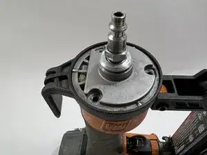 Установив гвоздезабиватель так, чтобы воздушный разъем был обращен к вам, используйте шестигранный ключ 3-го размера для удаления трех винтов.