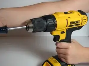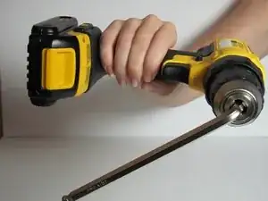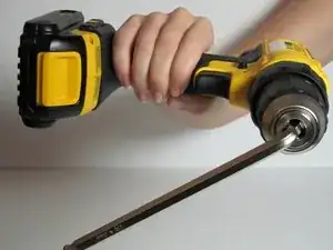 Неправильной рукой положите дрель горизонтально на край стола так, чтобы патрон свисал за край. Удерживайте голову дрели, сильно прижимая её к столу (не ту часть, где находится батарея).