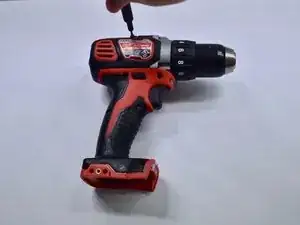 Снимите наклейку в нижней части ручки дрели.