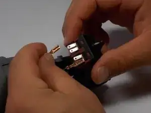 С помощью пальцев аккуратно снимите каждую из золотых клемм с переключателя питания. Возможно, вам придется немного покачать клемму взад-вперед, чтобы снять ее.