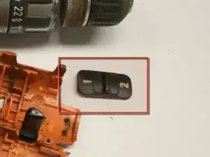 Найдите небольшую металлическую планку над пластиковой частью дрели.