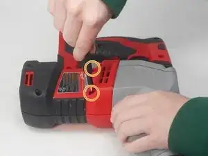 Удалите два винта длиной 24 мм на крышке корпуса под вентиляционными прорезями. Эти винты направлены внутрь дрели.