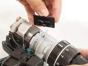 Оттяните металлическую серебристую скобу, расположенную ближе к задней части дрели, от моторного узла.