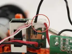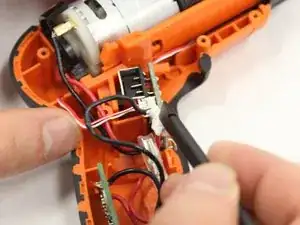 Найдите штекерный провод с красным и белым проводами, идущий к плате курка/переключателя.