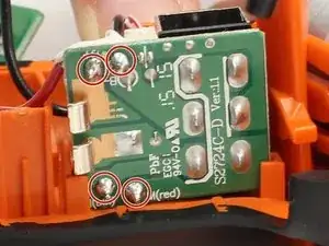 Чтобы заменить плату курка/переключателя, используйте паяльник для удаления четырёх паяных соединений, показанных на изображении.