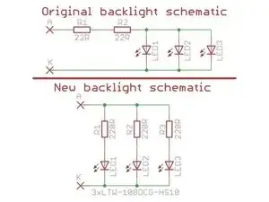 Проанализировав схему исходной подсветки, стало ясно, почему она выходит из строя: китайские конструкторы, создававшие дисплей, чтобы сэкономить место и деньги, соединили светодиоды параллельно.