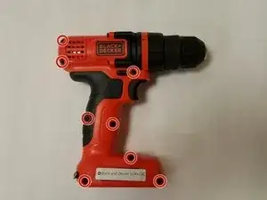 Поверните дрель на левую сторону — патрон должен быть обращен вправо. Найдите и удалите восемь крепежных элементов #2 X 5мм с крестовидным жалом из корпуса дрели.