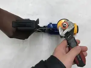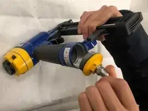 С помощью разводного ключа ослабьте жёлтую гайку, расположенную между ручкой и мужским адаптером воздушного компрессора.