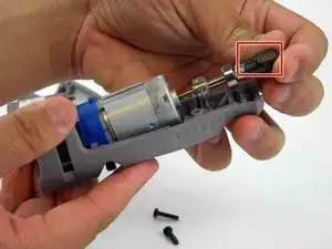 Синий контакт аккумулятора и пружина для кнопки блокировки вала могут вылететь, когда вы удалите сборку мотора с валом. Убедитесь, что вы следите за этими деталями, так как они очень маленькие.