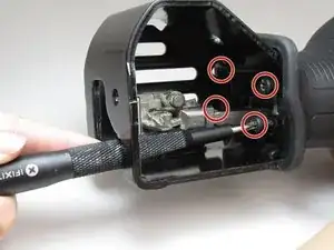 Открутите один винт Torx безопасности с цилиндрической головкой длиной 3/4 дюйма, фиксирующий сборку триггера, с помощью биты Torx T15H.