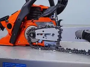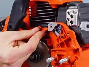 Поверните ручку тормоза цепи в сторону выемки шины, чтобы отцепить рычаг тормоза.