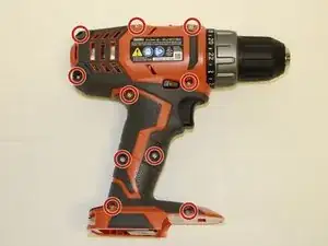 Используйте отвертку Torx T10, чтобы удалить десять винтов с боковой стороны информационной наклейки дрели.