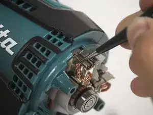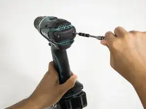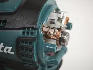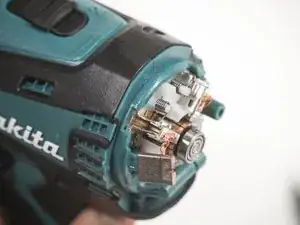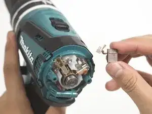 Дрель содержит две щётки. Этот гайд покажет вам необходимые шаги для их замены и укажет, как снять батарею и заднюю панель для доступа к щёткам.