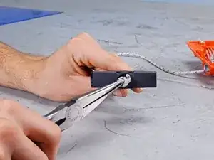 Плоскогубцами или пальцами вытащите узел затяжки верёвки из верхней части рукоятки стартера.