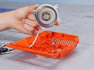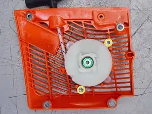 Будьте очень осторожны на этом этапе, в возвратной пружине большое натяжение. Если вы снимете пластину стартера слишком быстро, пружина может размотаться.