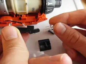 Чтобы заменить маленький светодиод, посмотрите под мотор спереди дрели и найдите чёрный пластиковый элемент, из которого выходят два очень тонких провода.