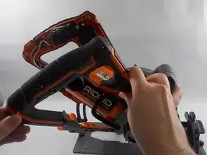 Уложите пилу с червячным приводом на бок, чтобы помочь снять триггер.