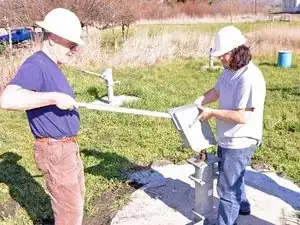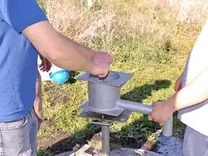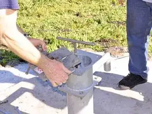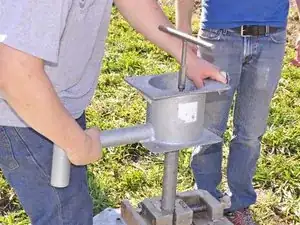 Поднимите водяной бак к Т-образной ручке и закрепите зажим для штока на насосном штоке.